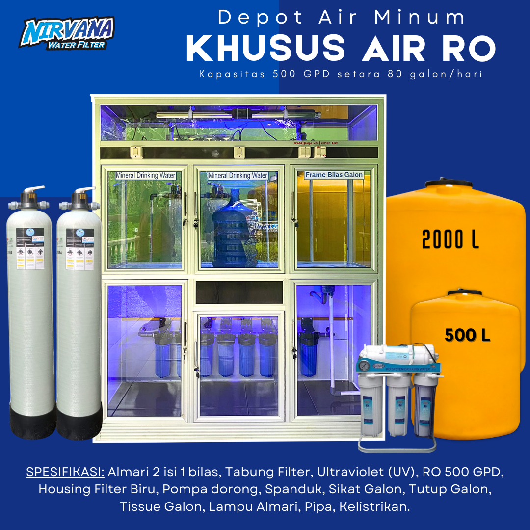 SPESIFIKASI: Almari 2 isi 1 bilas, Tabung Filter FRP Fiber, Ultraviolet (UV), RO 500GPD, Housing Filter Biru, Pompa dorong, Spanduk, Sikat Galon, Tutup Galon, Tissue Galon, Lampu Almari, Pipa, Kelistrikan. TEKNOLOGI TERKINI KUALITAS TERJAMIN.